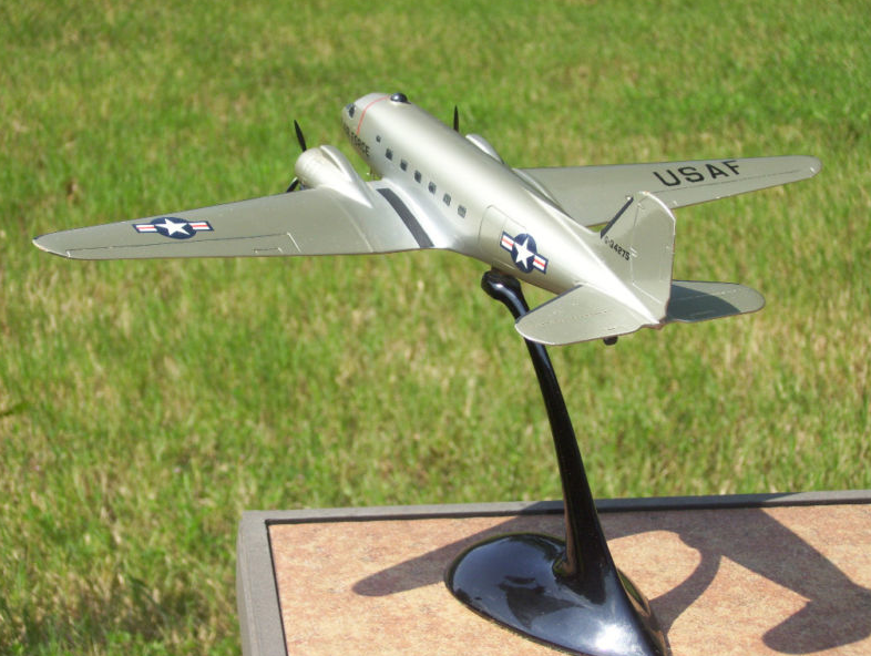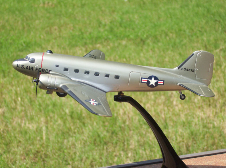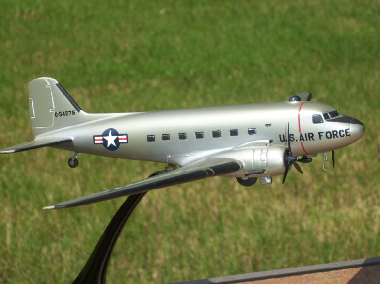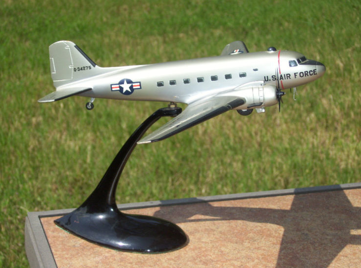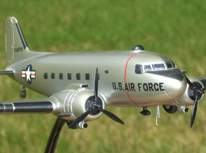 This auction is for a Douglas C-47 Skytrain Desk Model. The model was made in the 1950's by either Tenshodo or Nemoto. Both Tenshodo and Nemoto were famous Japanese model makers and they made some of the finest desk models. The model measures 12" wide and 8 1/2"" long. The model is made out wood and it sits on its original metal stand. The model is in great shape for being 60+ years old. The model has some amazing craftsmanship as all the flight surfaces, fuselage details, and engine details have been carved out. The models original propellers were lost some time ago, but the replacements look great. Tenshodo and Nemoto models are very rare and highly sought after.