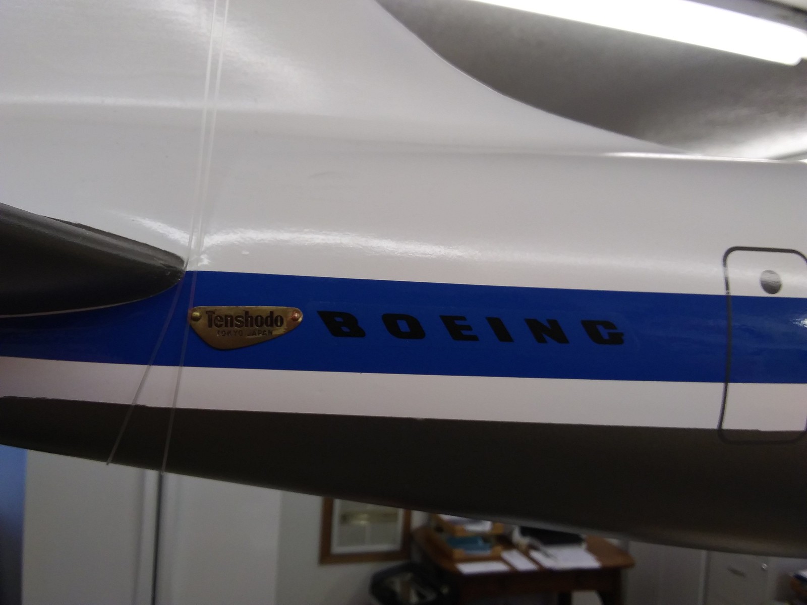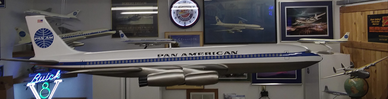 The model is a 1:24-scale Boeing 707-121, constructed of wood and fiberglass. Built by Tenshodo of Tokyo, Japan, we believe that this was among the very earliest large scale 707 models commissioned by Pan American. Since it depicts the 120 series aircraft, it was likely produced during the late-1950's and utilized around the time of the 707's 1958 introduction to commercial service. Gary indicates that it is not generally known that Tenshodo produced models of this scale, but found that the model is remarkably light-weight for its large size.
