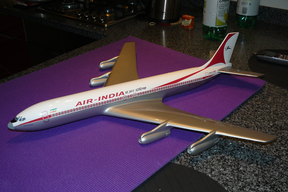 F-DECAL can custom produce any of their decal artworks into any sized custom printed decal. It is fairly expensive but well worth it when you consider the time and effort that goes into the restoration of a vintage airline display model. Here is a photo of the port side of my Air India Boeing 707 ... taken last night after I applied the decals to the port side only. I am very happy with the results.
