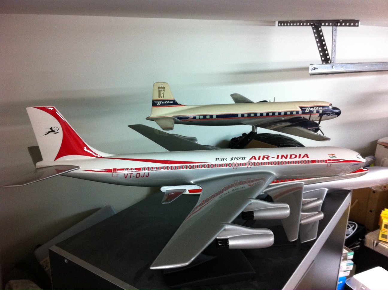 A number of years ago, I added a second large scale 707 model. This 1/50-scale 707 was produced by Westway Models, and had received some restoration work prior to my purchase. The Ebay seller was an Air France employee from Paris, and claimed that this model had been displayed in Pan American’s principal ticket office on the Champs d’Elysee in Paris. Once again, I have the stand, but it also fills the airspace above my work surface at home: