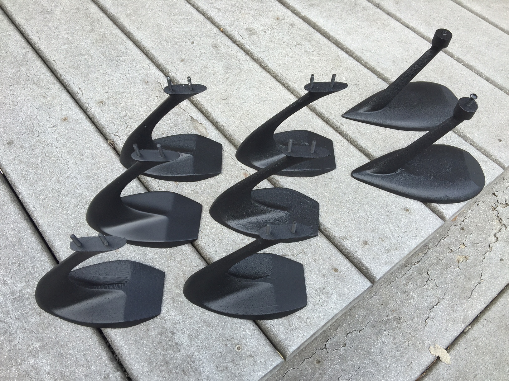 After casting the stands are cleaned and spray painted primer black. The finish is fresh from sandcasting, and not as cleaned up and smooth as a Vekuyl original stand. This level of finish requires much work (sanding, puttying, painting more than once). As such, you can achieve this level of finish by doing your own prep work on the stand if so desired. Or, you can use the stand as supplied.